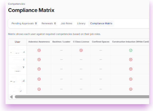The Competency Matrix gives you a traffic-light view of your entire workforce. You can upload licenses, set expiry dates, and get automated alerts before a worker becomes non-compliant.