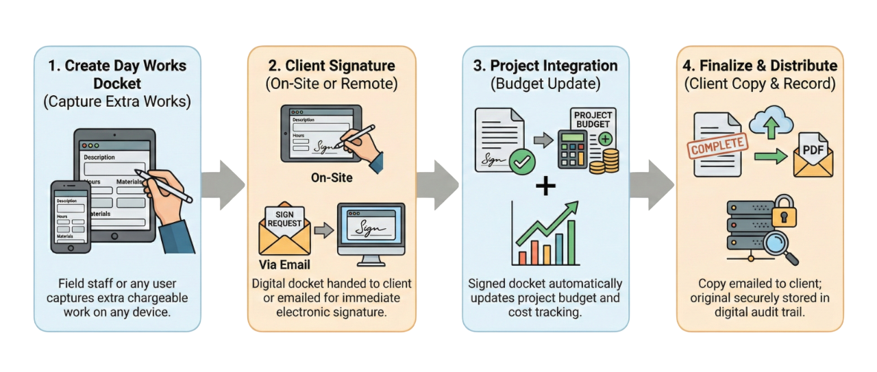 Supervisors create the Day Works Docket on-site with all the details—labour, plant, materials, photos. The client can sign directly on the device screen, or the system sends them an email with a secure signature request link. Once signed, the docket is locked and archived for invoicing.